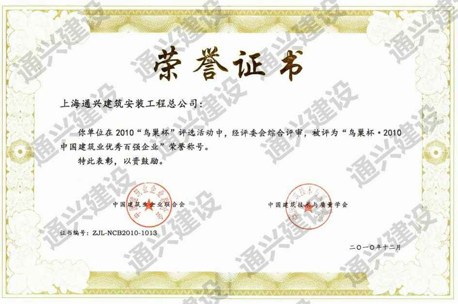 2010中国建筑百强企业 博鳌证书